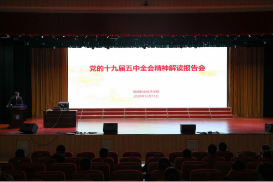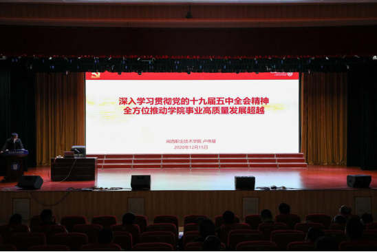 党委书记卢伟耀作题为《深入学习贯彻党的十九届五中全会精神全方位推动学院事业高质量发展超越》的专题报告。他指出,党的十九届五中全会是在我国决胜全面建成小康社会取得决定性成就,即将实现第一个百年奋斗目标、开启全面建设社会主义现代化国家新征程的关键时期召开的重要会议,也是在我国内外发展环境发生重大复杂变化的历史关口召开的重要会议,具有全局性、历史性意义。他要求,一要提高站位,深刻领会全会的核心要义、精神实质;二要准确把握,结合实际深入落实全会对教育事业发展作出的重大部署;三要以全会精神为指导,结合国家省市发展战略和学校战略部署,认真科学编制学校事业发展“十四五”规划;四要对标“双高”,建设好根植中央苏区的高水平高职院校;五要全面落实巡视工作要求,推动学院事业高质量发展超越。他强调,我们要践行为党育人、为国育才的初心使命,坚持以习近平新时代中国特色社会主义思想为指导,深入学习贯彻党的十九届五中全会精神,进一步增强“四个意识”、坚定“四个自信”、做到“两个维护”,传承闽西红色基因,赓续“红旗不倒精神”,以昂扬向上的精气神奋进新时代,奋力开创龙岩高职教育高质量发展新局面。