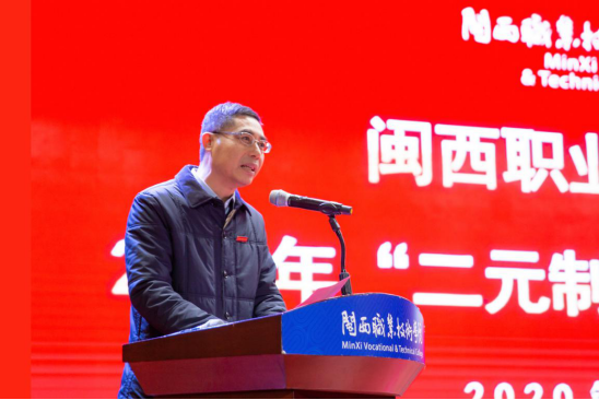 典礼上,郑志强代表学校向政府相关职能部门、行业、企业领导的到来表示热烈欢迎,他就我校发展历程、学校情况、办学成果等作了简要介绍。郑志强在致辞中表示,“二元制”办学模式极大提升了技术技能人才培养与产业需求契合度,对增强学校高质高效人才培养,精准服务地方经济发展有重要意义。郑志强提出,希望在座各位珍惜学习机会,遵守学校规章制度,认真学习,踏实工作,理论与实践并进,学以致用、知行合一,争取早日成为一名出色的技术技能型人才,为龙岩经济社会发展做出积极的贡献。
