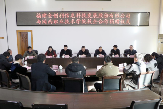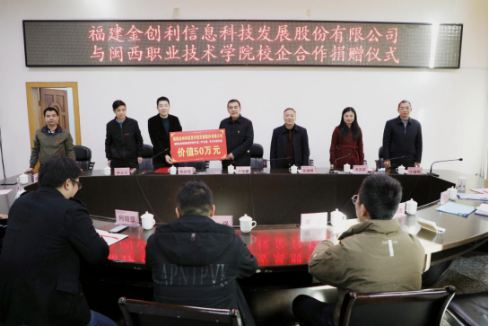 1月15日,我校与福建金创利信息科技发展股份有限公司举行校企合作捐赠签约仪式。金创利公司董事长陈济爱、副总经理李萍萍、研发部总监谢杰、教育事业部总监黄强,我校党委书记卢伟耀,教务处、对外交流合作处负责人,城乡建筑学院班子成员及教师代表参加了仪式。