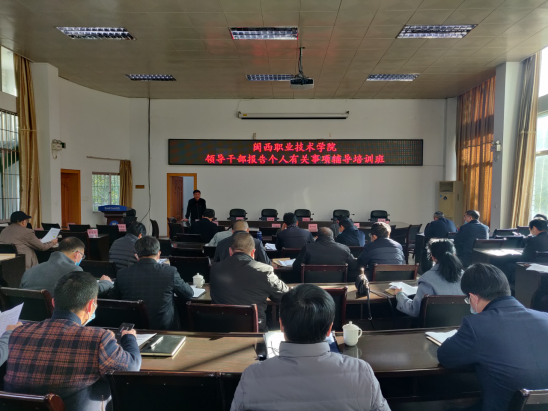 为深入学习贯彻习近平总书记关于领导干部报告个人有关事项工作的重要指示批示精神,巩固深化2020年专项整治工作成果,高质量做好我校2021年领导干部报告个人有关事项工作,1月19日,我校在第一会议室召开领导干部报告个人有关事项辅导培训班,全体处级及以上干部参加。