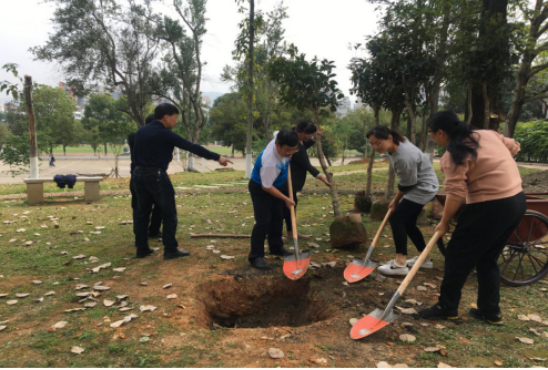 植树现场,教师们撸起袖子挥锹铲土,分工协作,默契配合,按标准挖好树坑,干劲十足,现场一片热火朝天。党员们纷纷表示,虽然双手磨破皮起水泡,但能在建党100周年的2021年春天在校园内亲手种下一棵树特别有纪念意义。党员教师们以实际行动践行绿色发展理念,弘扬党员志愿服务精神,为绿色闽大、美丽闽大贡献自己的一份力量。