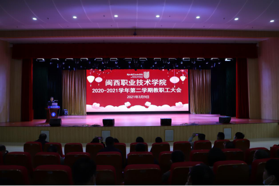 3月9日下午,我校2020-2021学年第二学期教职工大会在大匠堂举行。党委书记卢伟耀,校长郑志强,党委副书记李贞鑫,副校长吴新业,副校长刘路永,副校长卢兆梅,纪委书记温献荣及全体教职工参加。大会由李贞鑫主持。