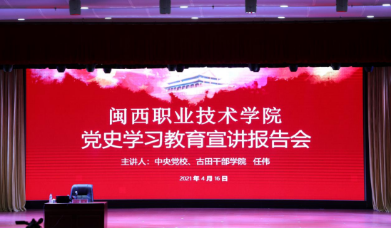为深入贯彻落实习近平总书记在党史学习教育动员大会上的重要讲话精神和中央关于在全党开展党史学习教育的部署,扎实推动党史学习教育走深走实,4月16日下午,我校在大匠堂召开党史学习教育专家宣讲报告会,中央党校思想理论发展史教研室副主任、北京大学历史学博士、中共龙岩市委副秘书长、古田干部学院副院长任伟教授受邀作《中国共产党的奋斗历程》专题讲座,在家校领导,全体教职工和青马工程学员代表聆听了报告会。党委书记卢伟耀主持报告会。