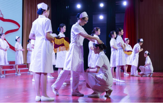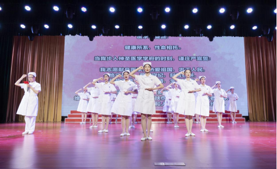 晚会现场,20名护理专业学生代表缓步上台,医护学院教师为她们戴上圣洁的燕尾帽,并把象征南丁格尔精神的蜡烛传递到她们手中,学子们在老师的带领下庄严宣誓。
