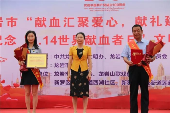 6月5日上午,由中共龙岩市委、龙岩市卫生健康委员会主办的龙岩市“献血汇聚爱心,献礼建党百年”暨纪念“6.14世界献血者日”文明实践活动在万宝广场前举行,我校荣获“全国无偿献血促进奖单位奖”,副市长郭丽珍为我校代表颁奖。