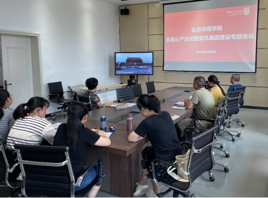 6月9日下午,生态环境学院党委在图书馆一楼会议室召开2021年度上半年全面从严治党暨党风廉政建设专题会议,深入学习十九届中纪委五次全会、省纪委十届六次全会、市纪委五届六次会议精神,认真学习学校党委《关于贯彻落实市委关于加强监督制约一体化推进不敢腐不能腐不想腐推动全面从严治党的若干意见的实施意见》、《生态环境学院党委会会议议事规则》、《生态环境学院党政联席会议议事规则》,研究推进学院2021年全面从严治党暨党风廉政建设工作。