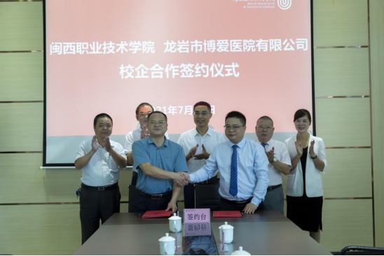 7月16日上午,我校与龙岩市博爱医院签订校企合作协议,共建教学医院,共同开设立综合门诊部,我校医务室将由乙方进行托管。我校校长郑志强、副校长卢兆梅、对外交流合作处负责人、后勤国资处负责人、医护学院行政负责人,博爱医院执行长刘斌,党支部书记、副院长廖文明,院长助理兰玉葱参加了签约仪式。