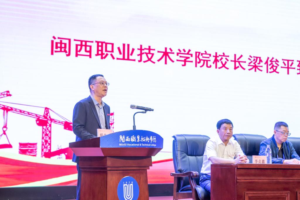 龙岩市教育局党组成员、副局长温寿春,龙岩市住房和城乡建设局建筑业科科长赖邦彤,龙岩市人力资源和社会保障局专家工作和职业能力建设科科长温禄华,龙岩市职业技术教育与就业指导中心主任张曙辉,福建建工装配式建筑研究院有限公司副总经理、总工程师、教授级高级工程师任彧,龙岩市建筑业协会会长黄芸,福建成森建设集团有限公司董事局主席苏振渊,市建筑行指委拟任委员单位负责人,以及我校校长梁俊平、党委副书记李贞鑫、教务处、对外交流合作处负责人、城乡建筑学院师生代表约350人参加大会。