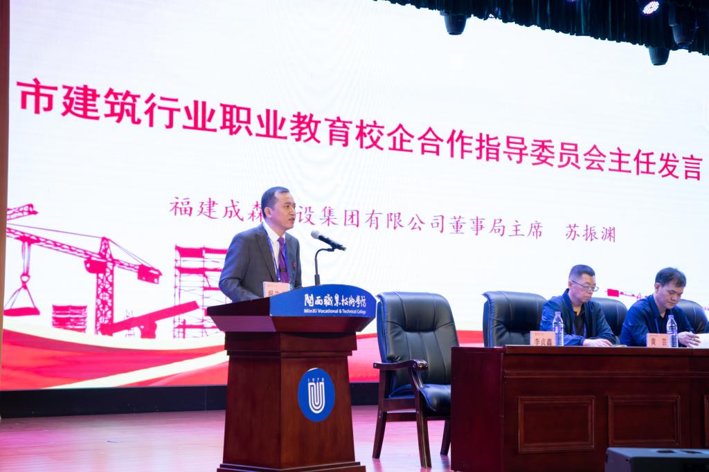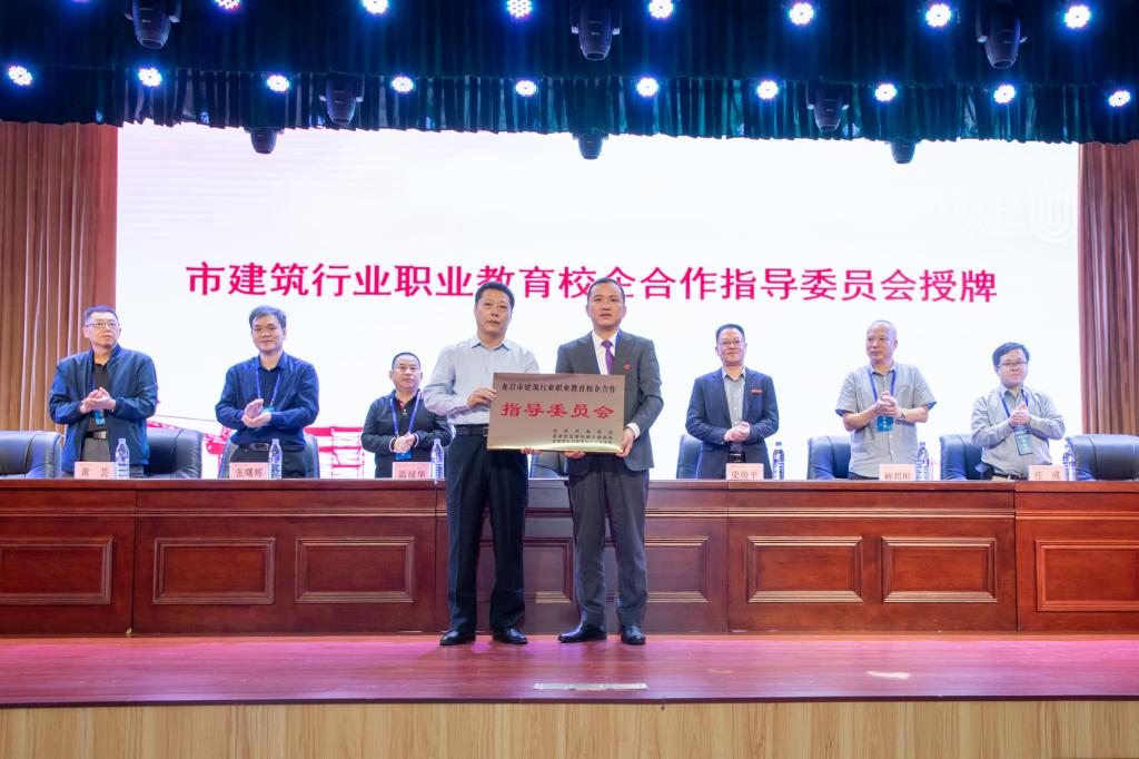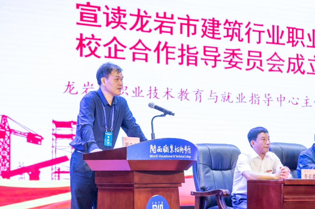 龙岩市教育局党组成员、副局长温寿春为龙岩市建筑行业职业教育校企合作指导委员会授牌,指导委员会主任苏振渊接牌。