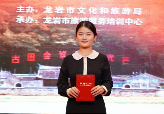 我校2019级旅游管理专业学生邹佳欣代表新罗区参加比赛,比赛中,邹佳欣通过个人展示、自选讲解、建党百年知识问答和红色故事分享四个环节的精彩展示,最终获得景区讲解组第二名,获“优秀讲解员”称号。