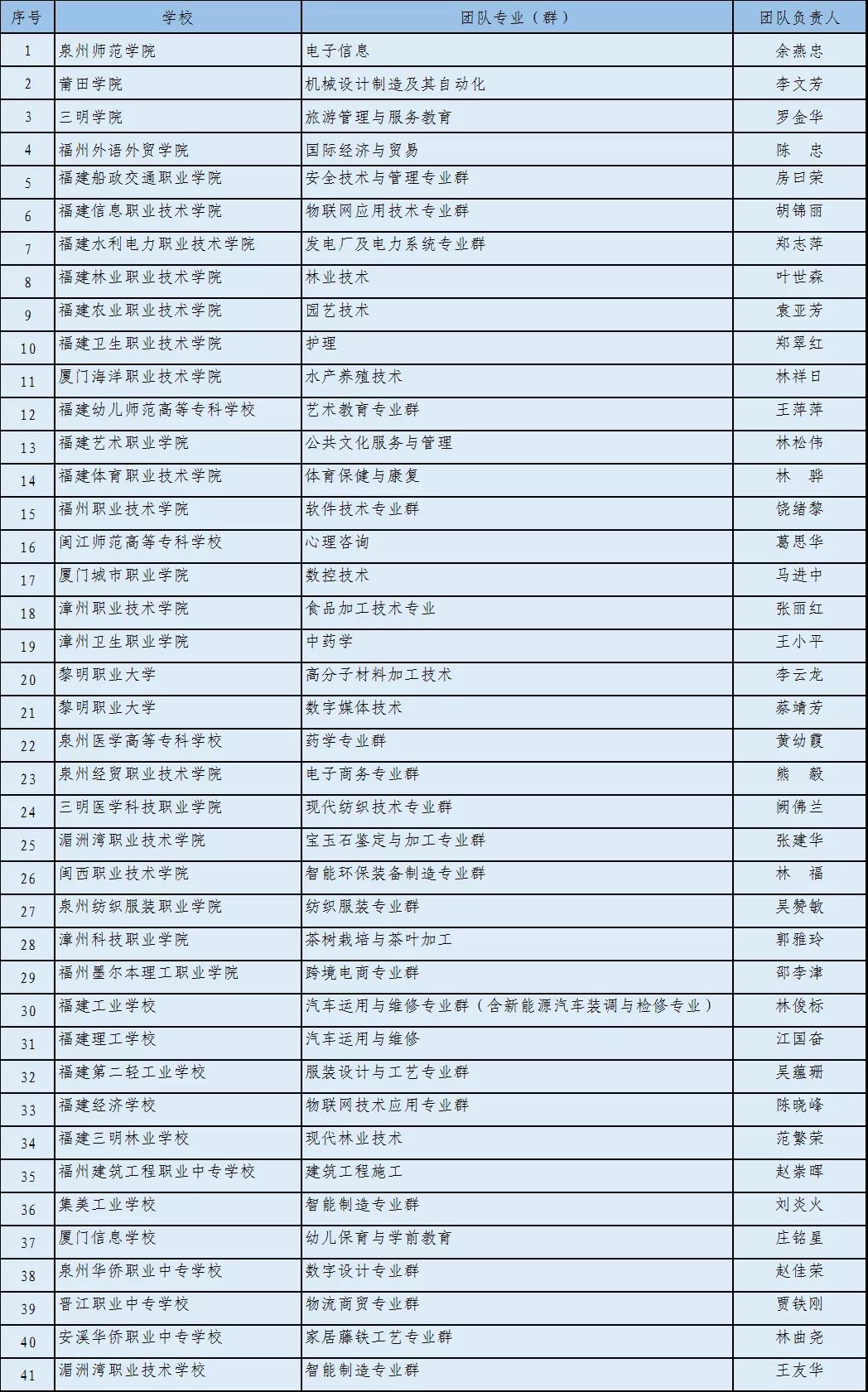 根据《福建省教育厅关于印发福建省职业教育教师教学创新团队建设方案的通知》、《福建省教育厅办公室关于遴选首批省级职业院校教师教学创新团队的通知》,经学校申报、专家评审、公示等程序,日前,省教育厅确定首批省级职业院校教师教学创新团队立项建设单位41个,并公布名单。我校林福教授领衔的智能环保装备制造专业群入选。