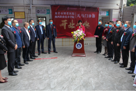 李贞鑫代表学校致辞,他指出,学校与博爱医院联合设立天马门诊部,是学校深入贯彻落实习近平总书记对职业教育重要论述精神,优化职业教育类型定位,深化产教融合、校企合作的重要举措。他强调,天马门诊部的成立,将进一步满足区域居民和我校师生多层次、多样化的医疗卫生服务需求,进一步完善我校医学教育实践教学工作,通过“以学促练、以练促用”强化“双师型”教师培养,构建医疗领域人才培训、科学研究、咨询服务和教学实践“四位一体”办学模式,建设校院合作、医教协同共同体。学校将以天马门诊部成立为契机,增强医疗行业职业教育适应性,培养更多医疗行业高素质技术技能人才,形成产教深度融合、政行企校互动、多方协同育人的职业教育高质量发展新格局。