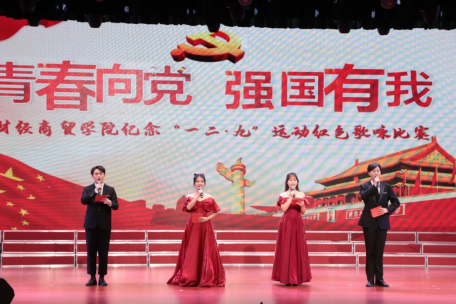 为进一步唱响时代主旋律,歌颂伟大祖国,激励广大青年的爱国爱党爱人民热情,发扬“五·四”“一二·九”爱国精神,推进学校文艺活动的蓬勃发展,丰富校园文化。财经商贸学院于2021年12月14日晚上在大匠堂举办了“青春向党,强国有我”为主题的红色歌咏比赛。出席本次晚会的领导有校党委卢伟耀书记、梁俊平校长、刘路永副校长,财经商贸学院党委书记卢德湖和班子全体成员、部分行政部门领导及财贸学院各位老师等嘉宾。