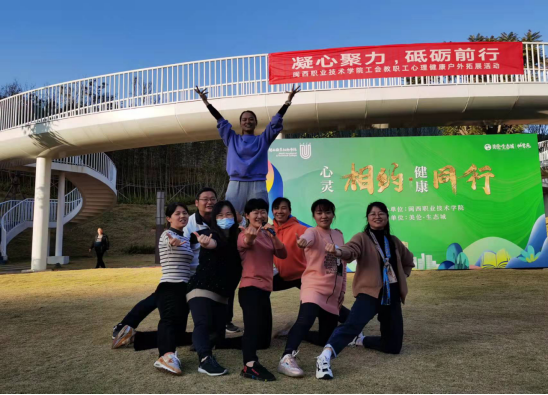 为缓解教职工身心压力,促进教职工的团队凝聚力和协作精神,提倡体育健身活动,增强体质,12月14日下午,校工会在美伦生态城·龙文化园开展了“心灵相约 健康同行”主题教职工心理健康户外拓展活动。校领导梁俊平、李贞鑫、吴新业、卢兆梅,校工会干部及各工会小组选派的100名教职工参加了活动。