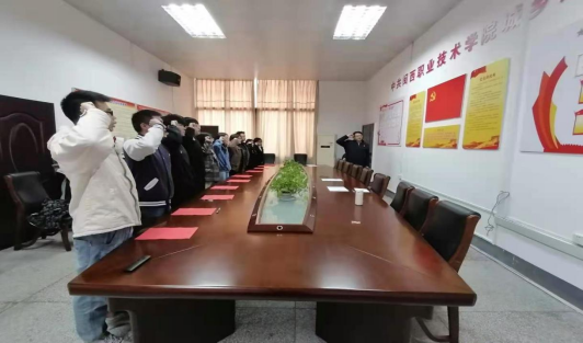 新发展党员代表王陶同学在发言中感谢党组织的关怀和培养,感谢同志们的关心和帮助。表示要时刻本着全心全意为人民服务的根本宗旨,不断提高自己为人民、为同学服务的能力,勤奋学习,努力拼搏,发挥党员模范带头作用,成为一技在手的新时代阳光工匠。