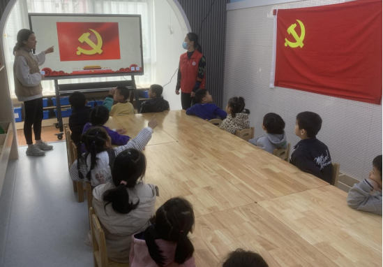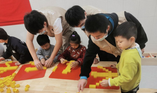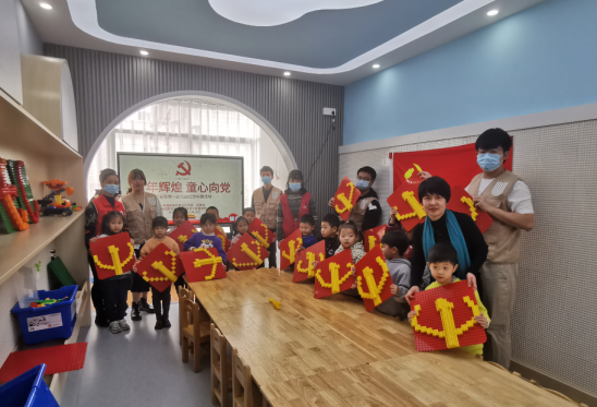 活动中,我校8名师生通过向儿童们科普共产党红色历史、党的百年辉煌、党徽的意义等红色知识,指导儿童们用乐高积木搭建由象征工人阶级的锤头和农民阶级的镰刀组成的中国共产党党徽,让孩子们从小学党史、感党恩、跟党走,让爱党爱国的种子在幼儿的心中播种。