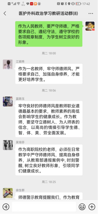 近日,医护学院组织开展师德师风警示教育系列活动,分别通过理论学习中心组学习、教研室学习研讨、全体教职工大会学习等多种形式组织全体教师深入学习《教育部公开曝光第九批7起违反教师职业行为十项准则典型案例》,积极引导教职工自重、自省、自警、自励,以案例为镜鉴,坚守纪律底线。