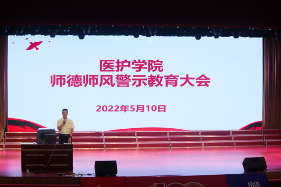 在教职工师德师风警示教育大会上,医护学院党委负责人强调,要提高政治站位,提升思想认识,主动增强加强师德师风建设的自觉性;要以《新时代高校教师职业行为十项准则》为职业规范,树立底线意识,加强师德修养,以身作则,为人师表;要以典型案例为鉴,严以律己,汲取教训,警钟长鸣;要坚守为党育人、为国育才的初心,传承红医文化、笃学修德精医,做党和人民满意的“四有”好老师。