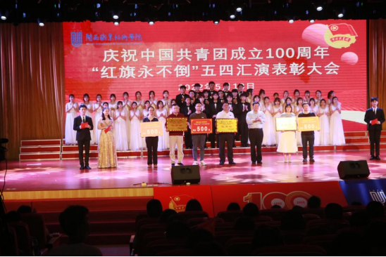 5月13日晚,我校庆祝建团百年“青春心向党,建功新时代”红旗永不倒五四汇演最后一场在大匠堂完美谢幕。校党委书记卢伟耀,副校长刘路永,各二级学院党政负责人及教育与同学们一同观看了本次汇演。