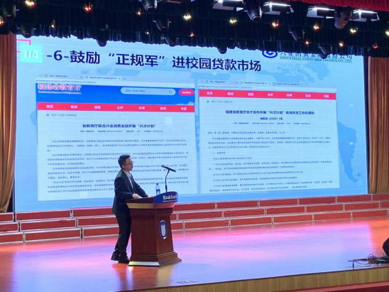 讲座以“谨防校园贷、电信诈骗及个人储蓄卡用卡安全”为主题,紧贴时代发展及大学生实际,从学生生活和切身利益出发,围绕校园电信诈骗辨识、校园非法集资辨识、校园不良网贷辨识、理性科学资金规划等四个方面介绍了金融基础知识、个人征信知识,同时还向学生讲授了贷前风险评估、贷中自我管理和贷后逾期管理的方法。蓝经理通过有奖问答等形式,与现场的学生积极互动,讲座在轻松愉悦氛围中达到了预期效果。