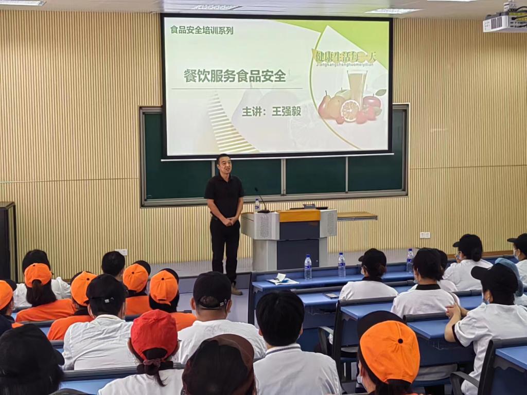 后勤国资处负责人作培训动员讲话,他说,食品安全是我们共同守护的生命线,是我们共同维护的高压线,必须常抓不懈。他提出要让食堂成为学生安全而温馨的港湾,抓好食品安全,提高食堂服务质量。