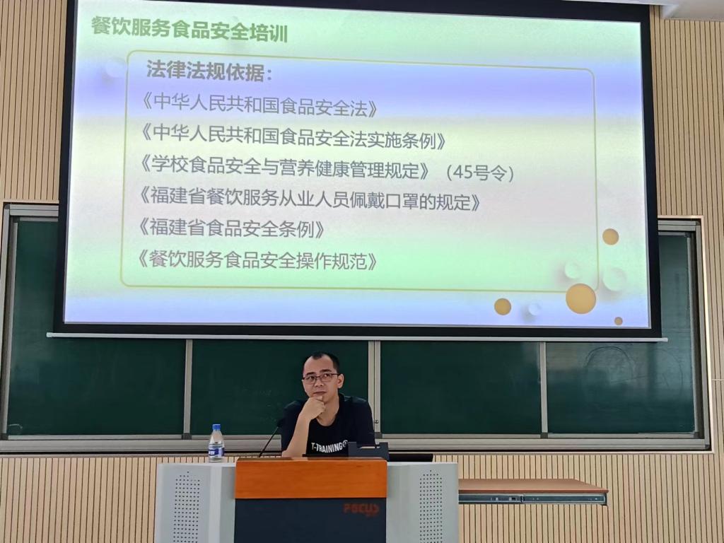 本次培训还邀请生态环境学院专业主任王强毅老师作了食品安全专题讲座。王强毅老师从如何提高风险意识和食品安全相关法律法规解读两个部分讲授,提高食堂管理人员和员工在食品安全上加强法律意识和责任意识,加强在食堂食材采购、生产加工、销售、仓储、配送等环节管理。