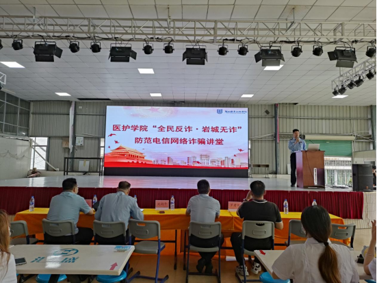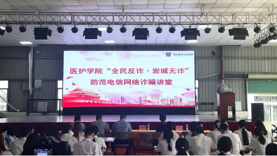 为打造平安、和谐校园,进一步加强防范“电信网络诈骗”宣传教育,5月25日下午 ,医护学院与校安全保卫处组织邀请曹溪派出所副所长刘向平警官和三级警长吴家佩为师生作“全民反诈·岩城无诈”防范电信网络诈骗讲堂,学院党委负责人主持,全院宿舍长以及300余名师生参加了活动。