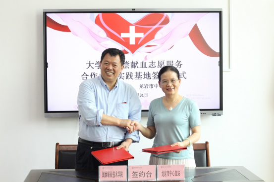 5月31日,我校与龙岩市中心血站举行“大学生无偿献血志愿服务合作共建实践基地”签约仪式。龙岩市中心血站黄丽平站长、曾德成副站长,血源管理科熊晓玫主任,我校副校长刘路永、后勤国资处负责人、校团委老师及爱心协会学生代表参加了签约仪式。