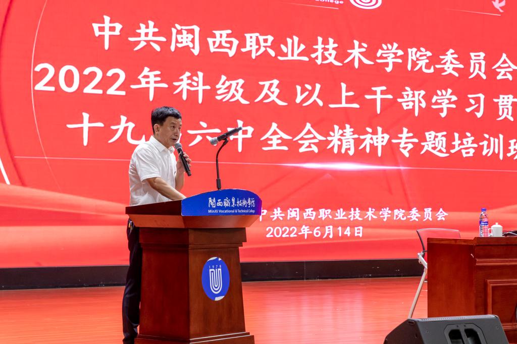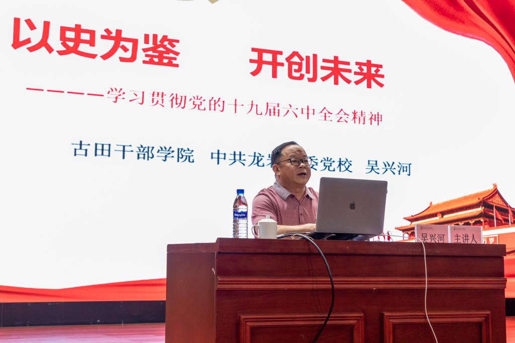 6月14日下午,中共无码人妻AV一二区二区三区委员会2022年科级及以上干部学习贯彻党的十九届六中全会暨省第十一次党代会、市第六次党代会精神培训班开班。本次培训班邀请了古田干部学院、龙岩市委党校党史党建教研部部长吴兴河副教授以《以史为鉴开创未来——学习贯彻党的十九届六中全会精神》为题,为全校科级及以上干部作开班第一讲。