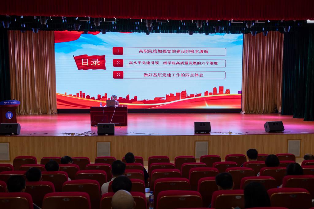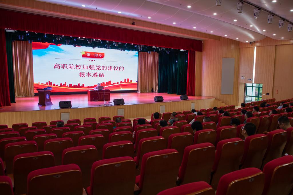 在报告会上,董东明同志组织大家一起重温了习近平总书记关于高校坚持党的领导、加强党的建设重要论述,全面分析了“双高计划”党的建设重要任务,结合其多年党务工作实践经验,从六个维度深刻阐述加强基层组织建设、引领高质量发展的有效路径,并分享了做好党建工作的四点体会。