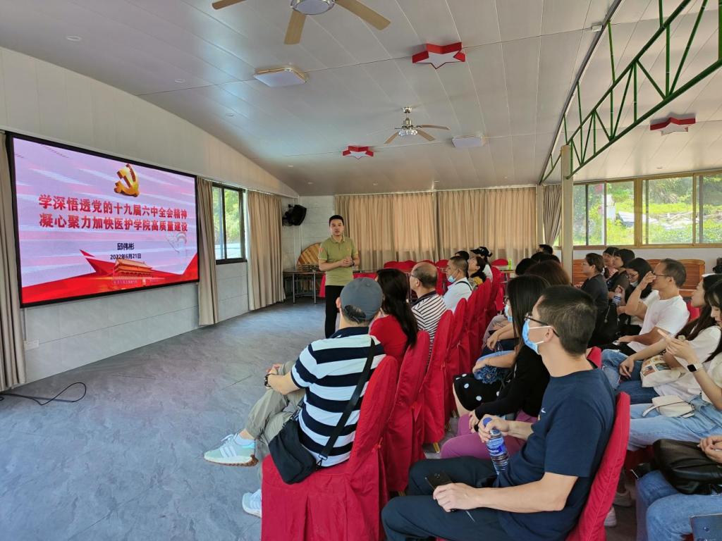 党委负责人为党员们上了一堂题为《学深悟透党的十九届六中全会精神凝心聚力加快医护学院高质量建设》的党课,从党的十九届六中全会的基本概况和《中共中央关于党的百年奋斗重大成就和历史经验的决议》的重要意义、重要成就等几个方面,对十九届六中全会精神进行了全面解读,并结合医护学院工作实际,对进一步深入学习贯彻党的十九届六中全会精神提出了具体要求。