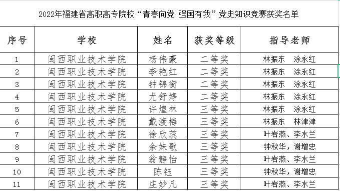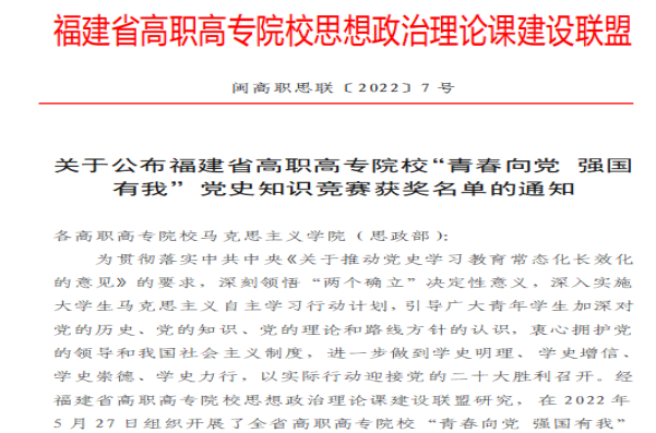 近日,从福建省高职高专院校思想政治理论课建设联盟《关于公布福建省高职高专院校“青春向党,强国有我”党史知识竞赛获奖名单的通知》(闽高职思联【2022】7号)获悉,我校学子喜获二等奖4项、三等奖7项。