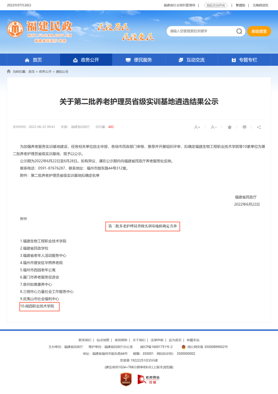 为贯彻落实《福建省推进养老服务发展(2019-2022年)行动方案》(闽政办〔2019〕49 号)精神,医学护理学院不断加强养老服务师资队伍建设,提升社会服务能力。2022年1月,在医学护理学院的积极组织申报下,经龙岩市民政部门审核、推荐及福建省民政厅评审,6月底我校成功入选福建省民政厅第二批养老护理员省级实训基地。据悉,我省仅四所高职院校入选省民政厅养老护理员省级实训基地——这是我校健康服务专业群实训基地继2018年省级职业院校特色实训基地、2020年省级高水平专业化产教融合型实训基地之后又添一基地。