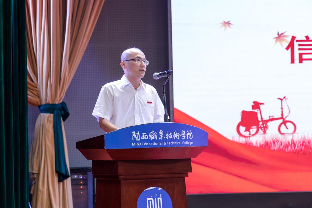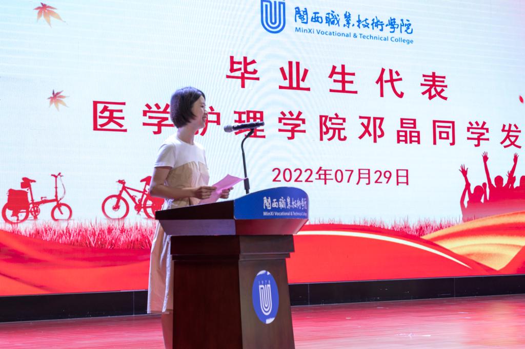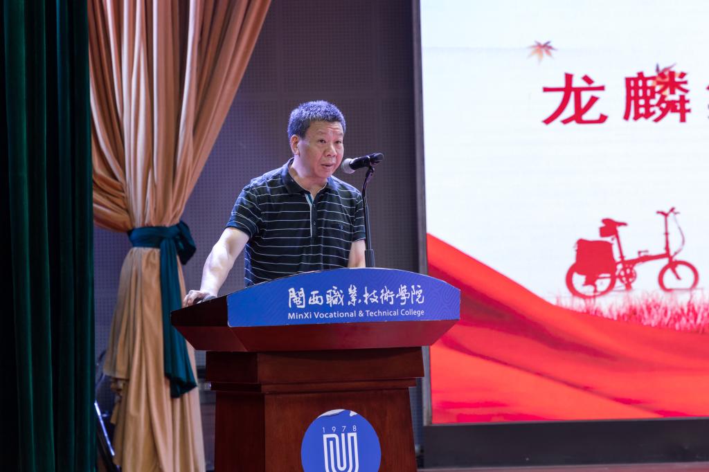 典礼在庄严的国歌声中拉开帷幕。会上,吴新业副校长宣读了二元制优秀毕业生的表彰决定,药学专业毕业生邓晶、信息与制造学院林福教授、福建龙麟集团有限公司副总经理黄永生分别代表毕业生、授课老师、合作企业进行了发言。