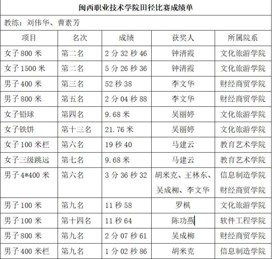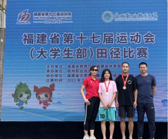 2022年8月2日-8月7日,福建省第十七届运动会(大学生部)田径比赛在泉州职业技术大学晋江校区举行,来自全省82所高校的1042多名运动员参赛。本次比赛我校参加了100米,200米,400米,800米,1500米,5000米,跨栏,铅球,铁饼,三级跳远,接力等项目的角逐,最终获得一等奖2项,二等奖2项,三等奖3项。在4*100米接力比赛中,软件工程学院的陈功燕同学在受伤后仍跑完接力的最后一棒,赛后受伤部位缝了多针,充分发扬了顽强拼搏、团结奋进的精神风貌。最终,钟清霞、陈功燕获个人“体育道德风尚奖”。