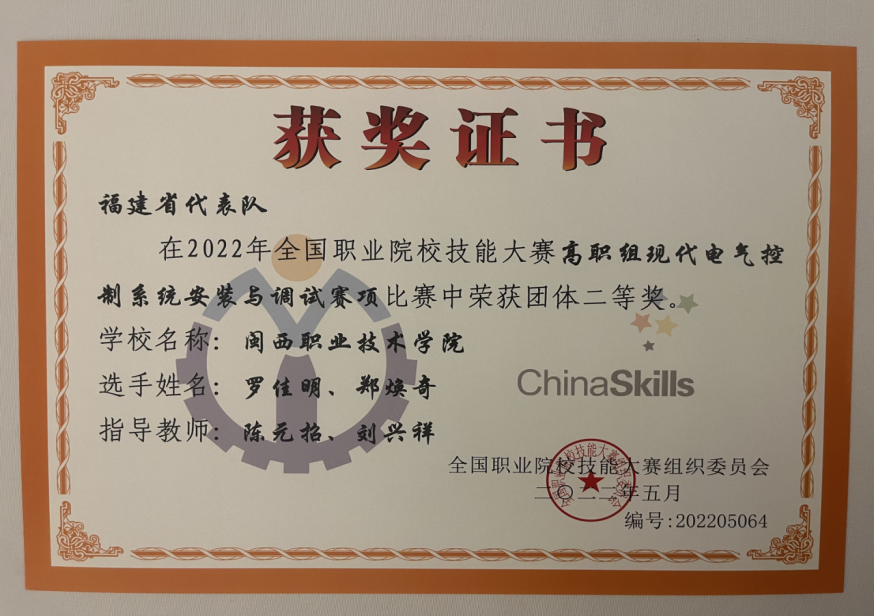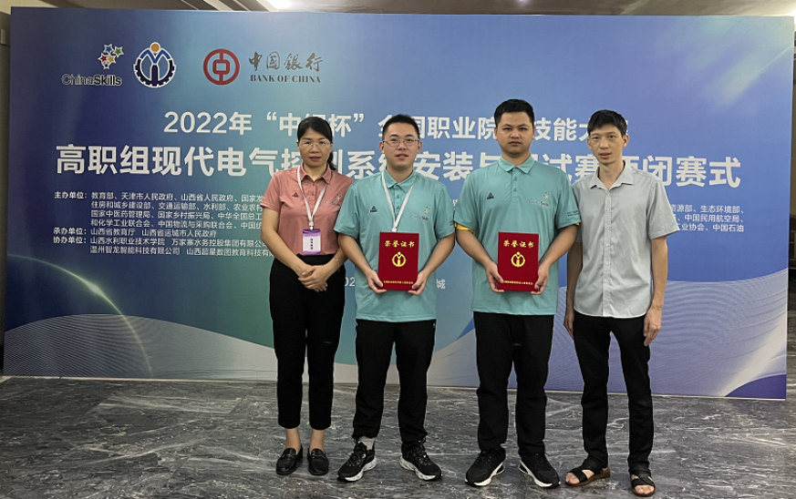 8月13日, 2022年度全国职业院校技能大赛“现代电气控制系统安装与调试”赛项在山西运城开赛,各省市共选派出57个优秀代表队同场竞技,经过两天艰苦而激烈的角逐,我校2019级电气自动化技术专业学生罗佳明、郑焕奇以及指导教师陈元招、刘兴祥组成的代表队荣获国赛二等奖的好成绩。