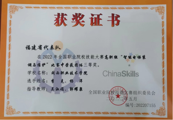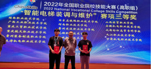 8月17日, 2022年度全国职业院校技能大赛“智能电梯装调与维护”赛项在山东潍坊开赛,各省市共选派出51个优秀代表队同场竞技,经过两天艰苦而激烈的角逐,由我校2019级电梯工程技术专业学生李克、20级电梯工程技术专业学生杨洋以及指导教师吴淑娟、郭耀泉组成的代表队荣获国赛三等奖的好成绩。