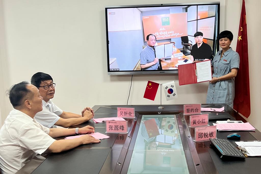 为深化国际交流合作、推进职业教育改革发展、强化学校“双高”建设,9月7日上午,我校与韩国新罗大学(Silla University)举行国际合作线上交流会暨项目“云”签约仪式,双方在学位课程培养、教职员工培训及学历提升、教育教学资源共享、科学研究等合作事宜进行了友好交流。我校副校长吴新业,教务处、对外交流合作处等职能部门负责人,韩方中国区主任吴起涛教授、国际交流处主任李昌洙及国际交流部老师共同出席了此次交流会并一起见证了“云”签约仪式举行。副校长吴新业代表学校致辞,对外交流合作处负责人梁玉兰代表学校签约。