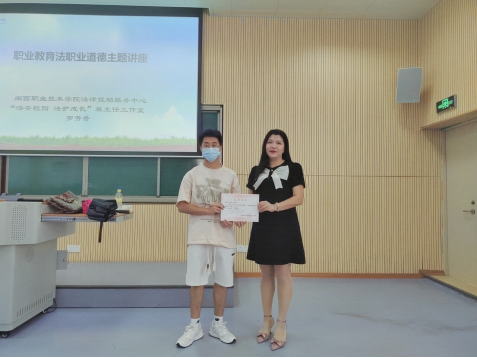 讲座进行中同学们认真聆听、虚心学习,纷纷表示对职业教育法和行业法规职业道德有了清晰认识。树立了要成长为新时代阳光工匠不仅在专业技能上要精专锤炼,还需遵守法律法规和涵养职业道德。法律援助服务中心“法助成长”宣讲团成员也深感受益匪浅,本场讲座的样板演示也为他们之后更好的在二级学院开展普法教育活动奠定基础,让同学们更好地做到学、思、悟、练。