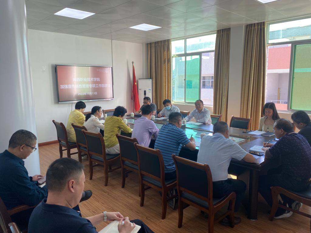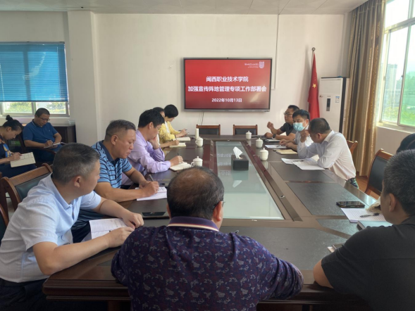 10月13日上午,我校召开加强宣传阵地管理专项工作部署会,副校长卢兆梅、各部门负责人、各二级学院党委书记参加会议。宣传部(统战部)负责人主持会议。会议强调加强网络阵地隐患排查,守牢底线,并做了下一步宣传阵地管理工作部署。