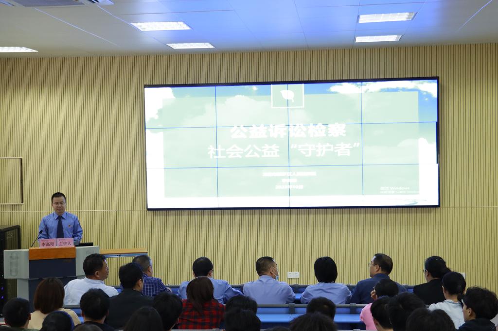 李高阳检察长从检察以生态环保领域公益诉讼案例为切入点,深入浅出、生动形象地阐述公益诉讼制度的现实意义、检察公益诉讼的类型、检察公益诉讼的领域、检察公益诉讼现状等四个方面内容,凸显检察诉讼在生态环境保护、食品药品安全、国有资产保护、国有土地使用权出让和英烈权益保护等领域的重要性,进一步提高师生法律意识、法治观念、法治思维。