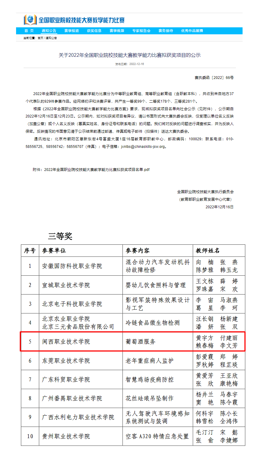 在2022年全国职业院校教师教学能力大赛获奖公示中,我校黄宇方、付建丽、赖春梅、李文芳教师团队《葡萄酒服务》项目荣获三等奖。