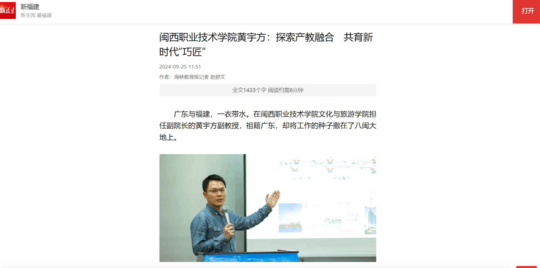 在教学中,黄宇方突出“专业+思政”,将专业技能与思政教育紧密结合起来,将红色文化元素融入课程思政,通过红色景点讲解、红色故事比赛、“文小旅看龙岩”系列短视频等形式,让学生“传承红色基因、讲好闽西故事”。“黄老师指导我们利用短视频宣传龙岩红色旅游资源,让更多人了解龙岩的红色历史和革命精神,丰富了我们的课外生活。”一名学生说。