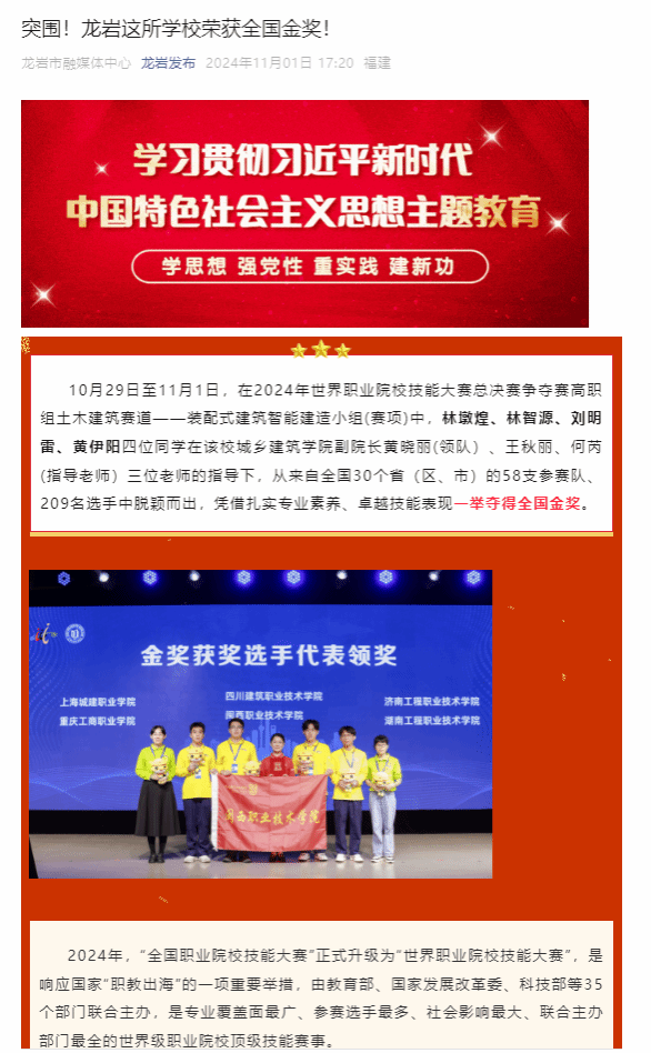 上一条:【新福建】龙岩学子在2024世界职业院校技能大赛中获三金三银五铜