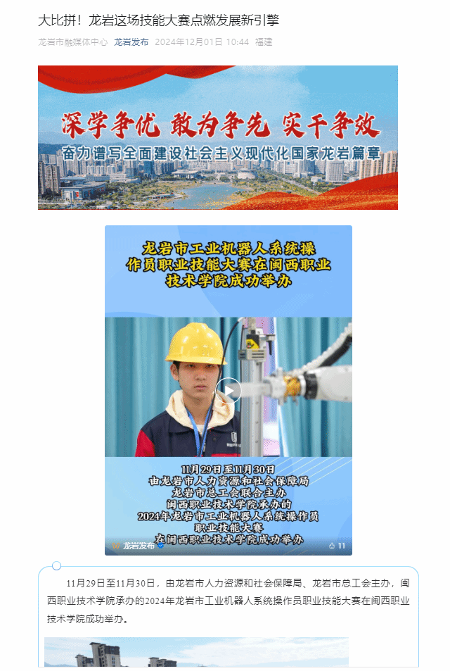 下一条:【闽西日报】我市举办工业机器人系统操作员职业技能大赛