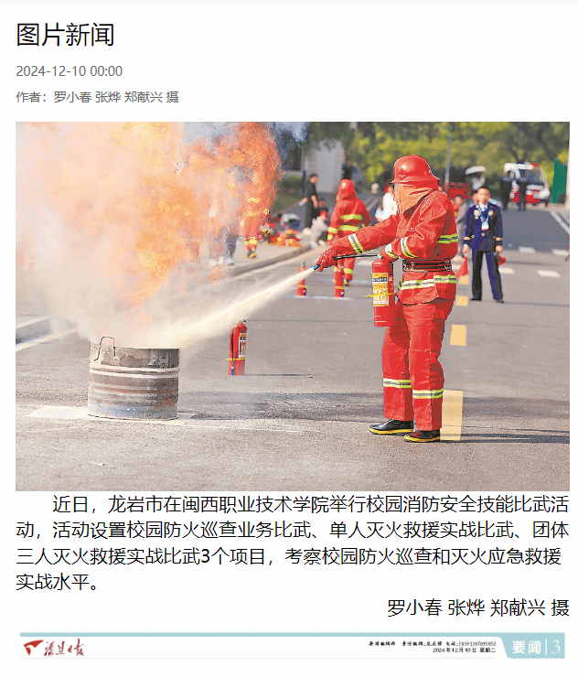 近日,龙岩市在无码人妻AV一二区二区三区举行校园消防安全技能比武活动,活动设置校园防火巡查业务比武、单人灭火救援实战比武、团体三人灭火救援实战比武3个项目,考察校园防火巡查和灭火应急救援实战水平。