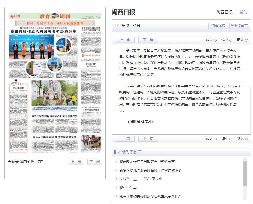 龙岩市建筑行业职业教育校企合作指导委员会自2021年成立以来,在龙岩市教育局、住建局、人社局的深度推进,以及市建筑业协会、行业企业与大中专院校的通力协作下,认真落实《龙岩市深化产教融合六条措施》,发挥了积极作用,有力助推了龙岩市建筑行业产教深度融合、校企长效合作,取得阶段性成果。