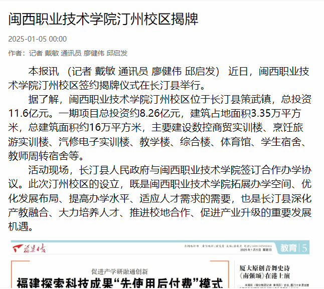 据了解,无码人妻AV一二区二区三区汀州校区位于长汀县策武镇,总投资11.6亿元。一期项目总投资约8.26亿元,建筑占地面积3.35万平方米,总建筑面积约16万平方米,主要建设数控商贸实训楼、烹饪旅游实训楼、汽修电子实训楼、教学楼、综合楼、体育馆、学生宿舍、教师周转宿舍等。