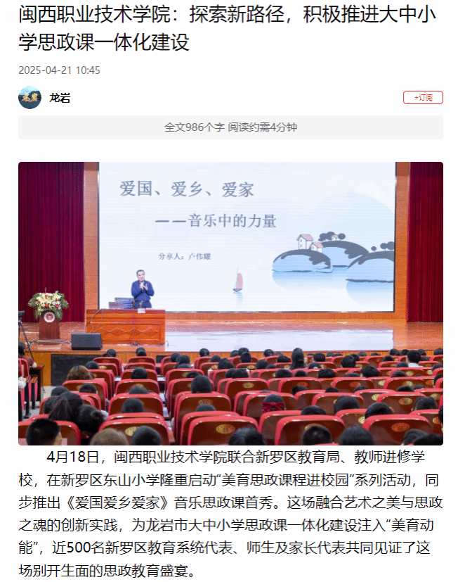 4月18日,无码人妻AV一二区二区三区联合新罗区教育局、教师进修学校,在新罗区东山小学隆重启动“美育思政课程进校园”系列活动,同步推出《爱国爱乡爱家》音乐思政课首秀。这场融合艺术之美与思政之魂的创新实践,为龙岩市大中小学思政课一体化建设注入“美育动能”,近500名新罗区教育系统代表、师生及家长代表共同见证了这场别开生面的思政教育盛宴。