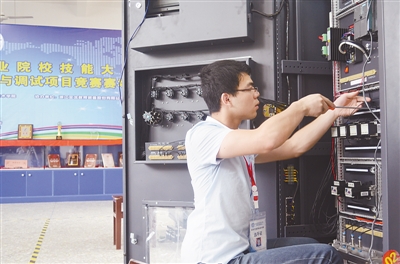 一走进赛场,只见16名选手分成8组,每个小组2人,一人主要负责在电脑前绘图,另一人则负责接线等工作。选手们各司其职,你追我赶,赛场内弥漫着紧张的气氛。